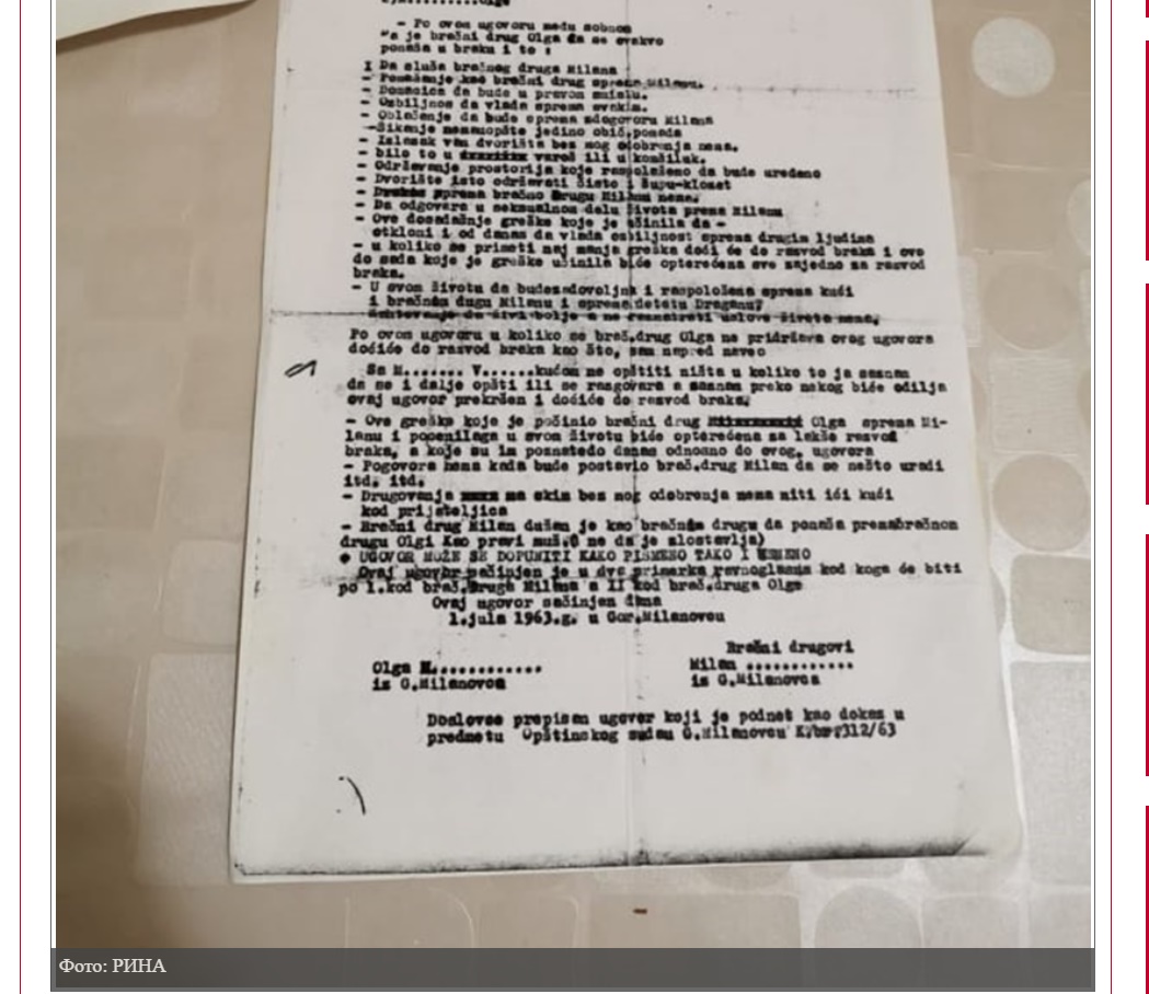 “Пре пола века бракови у Србији били су много другачији него данас. Знало се ко вози трактор, а ко отвара капију, а уколико не би било онако “како Бог заповеда” онда би се код судије носили папири за развод. То је учинио и Средоје, давне 1963. године, јер му се, како је наведено у документима, учинило да његова супруга Милеса “свраће код комшије чешће него што би требало, а и село је почело да прича како између њих двоје нешто има” и то овај сеоски домаћин више није могао да трпи већ је затражио развод”, рекао је раније за РИНУ један од извора који је имао увид у необичан уговор.