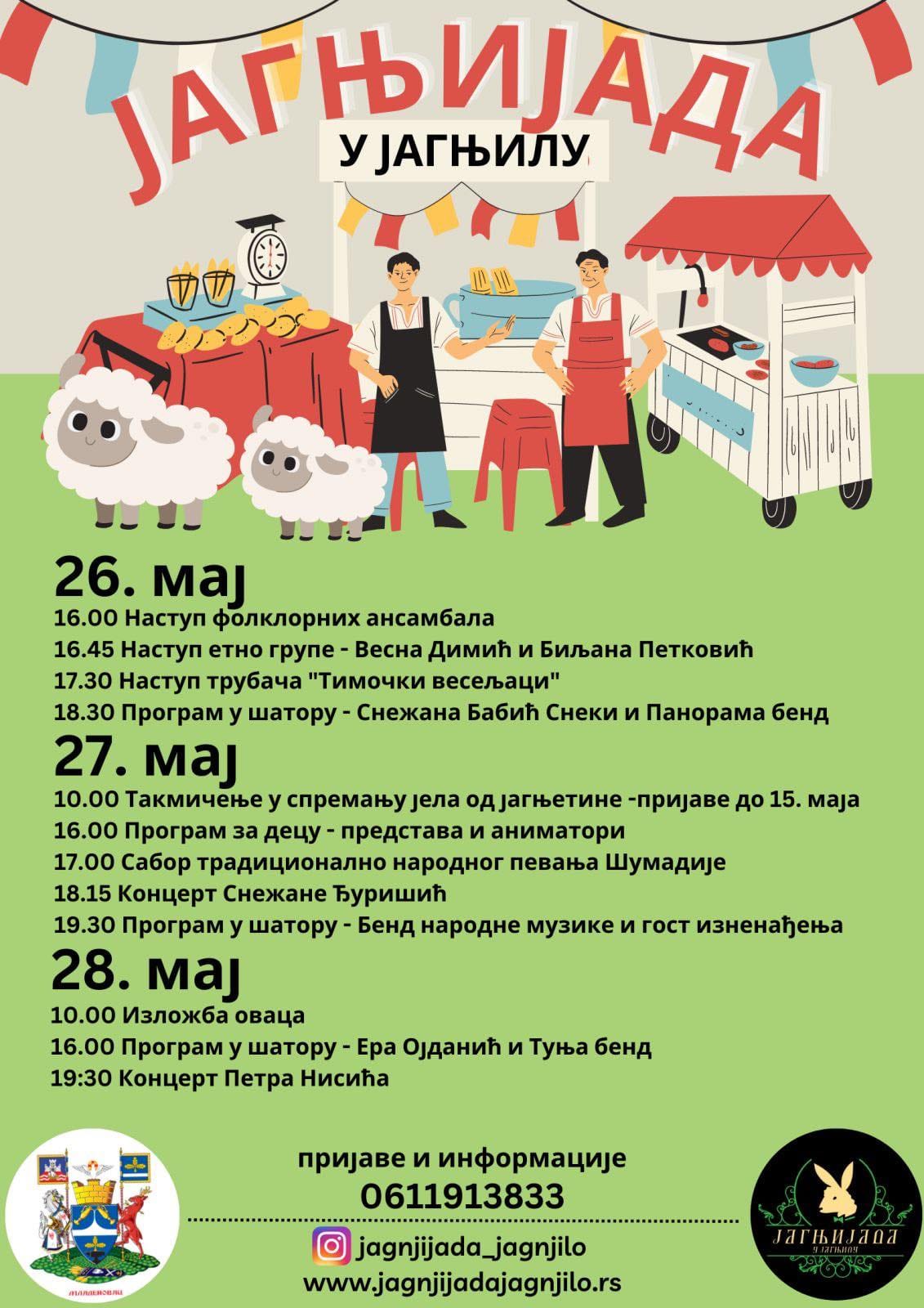 Младеновац, Јагњило – У петак 26. маја почиње тродневна манифестација “Јагњијада” у Јагњилу. Првог дана ове манифестације у 16 часова наступиће фолклорни ансамбли а потом у 16:45 наступ етно групе Весна Димић и Биљана Петковић. Од 17:30 наступиће трубачки оркестар “Тимочки весељаци” а од 18:30 у шатору госте ће забављати Снежана Бабић Снеки и Панорама Бенд.