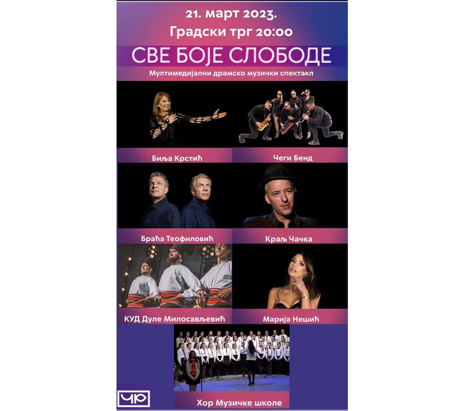 Већ у среду, 22. марта са почетком у 20 часова на Градском тргу у Чачку наступиће један од најпопуларнијих рок бендова свих времена, Рибља Чорба! Повратак рок легенде Боре Ђорђевића у родни град увеличаће комплетан догађај, а један од најважнијих у новијој историји града.