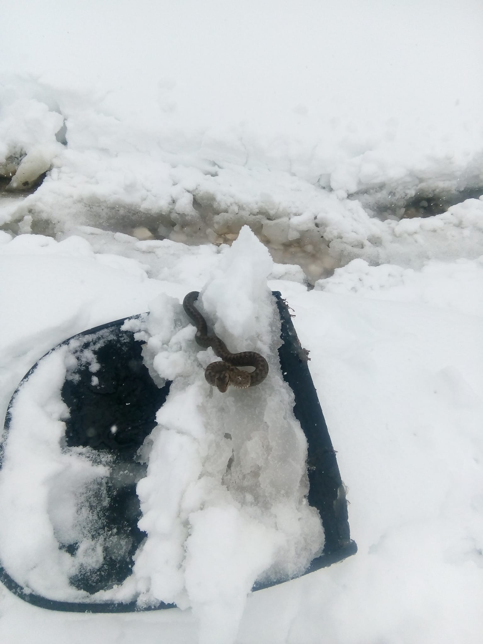 Аранђеловац, Јеловик – Изненадни снег у априлу и ниске температуре збуниле су и животиње које су због топлих дана који су претходили хладном таласу изашле из зимовника у природу. Нагла промена времена и њих је изненадила па је тако једна змија највероватније остала завејана. Њу је чистећи снег пронашао Милорад Јанковић из села Јеловик код Аранђеловца.
