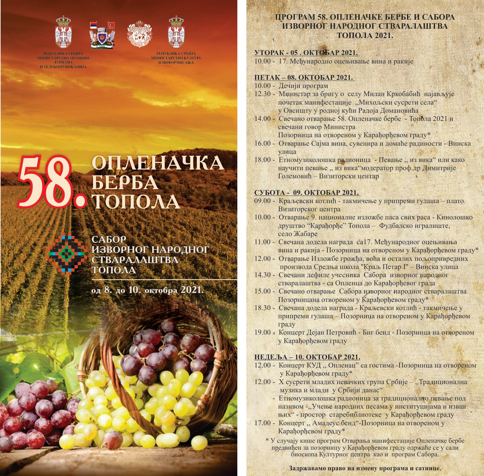 Поред тога, министар Кркобабић ће од 14:00 на позорници у Карађорђевом граду у Тополи званично, поздравним говором, отворити 58. Опленачку бербу, саопштено је из службе за информисање општине Топола.