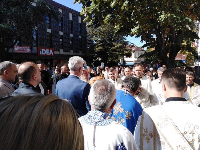 Након литије која је ишла улицама Тополе, славски колач пресечен је испред зграде Општинске управе.