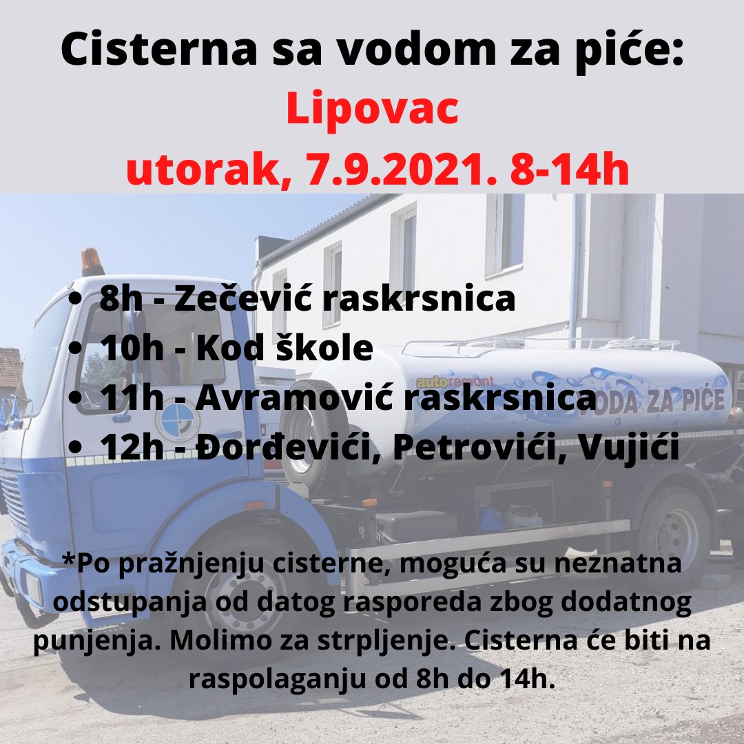 Цистерна са водом за пиће биће сутра у Липовцу од 8-14 часова а канистери који су распоређени по селима јутрос су допуњени са техничком водом.